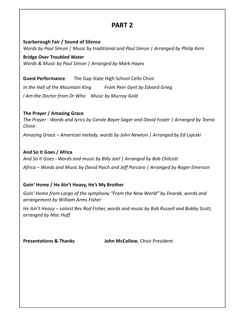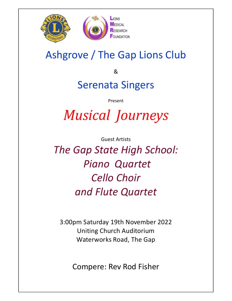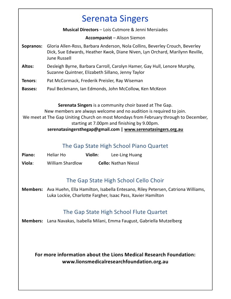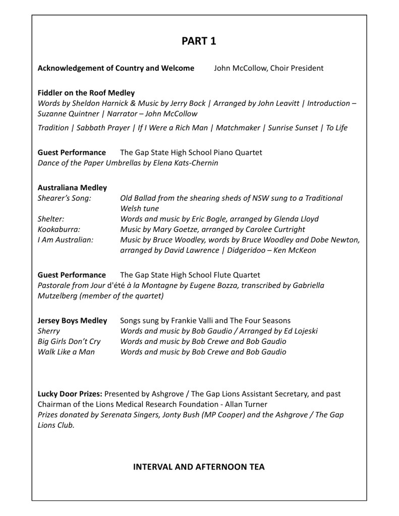 See the program below for details of our Gala Concert on Saturday afternoon 19th November 2022 at 3pm at The Gap Uniting Church. Tickets on sale at the door. Don’t miss the Serenata Singers and ensembles from The Gap State High School performing popular pieces.