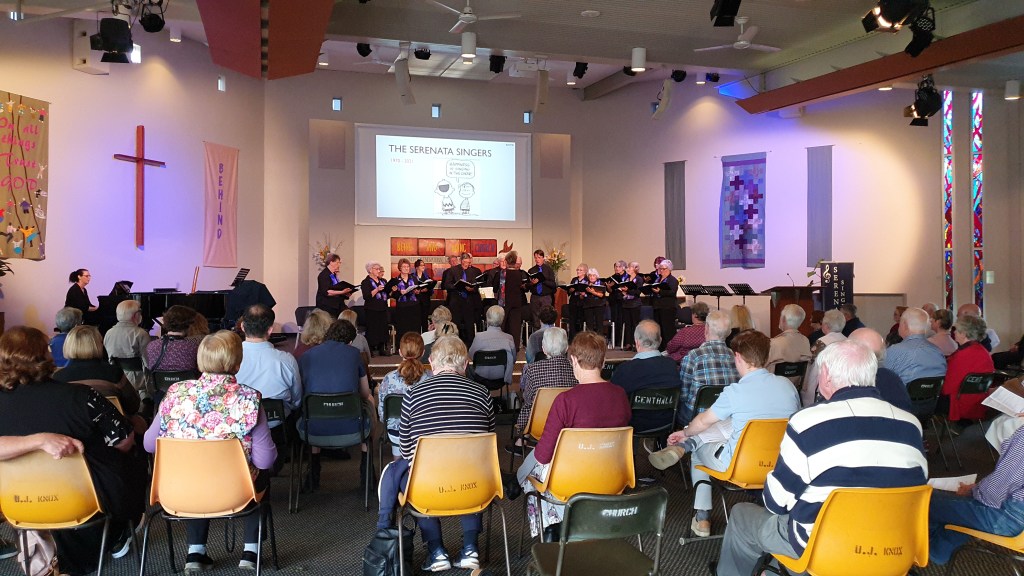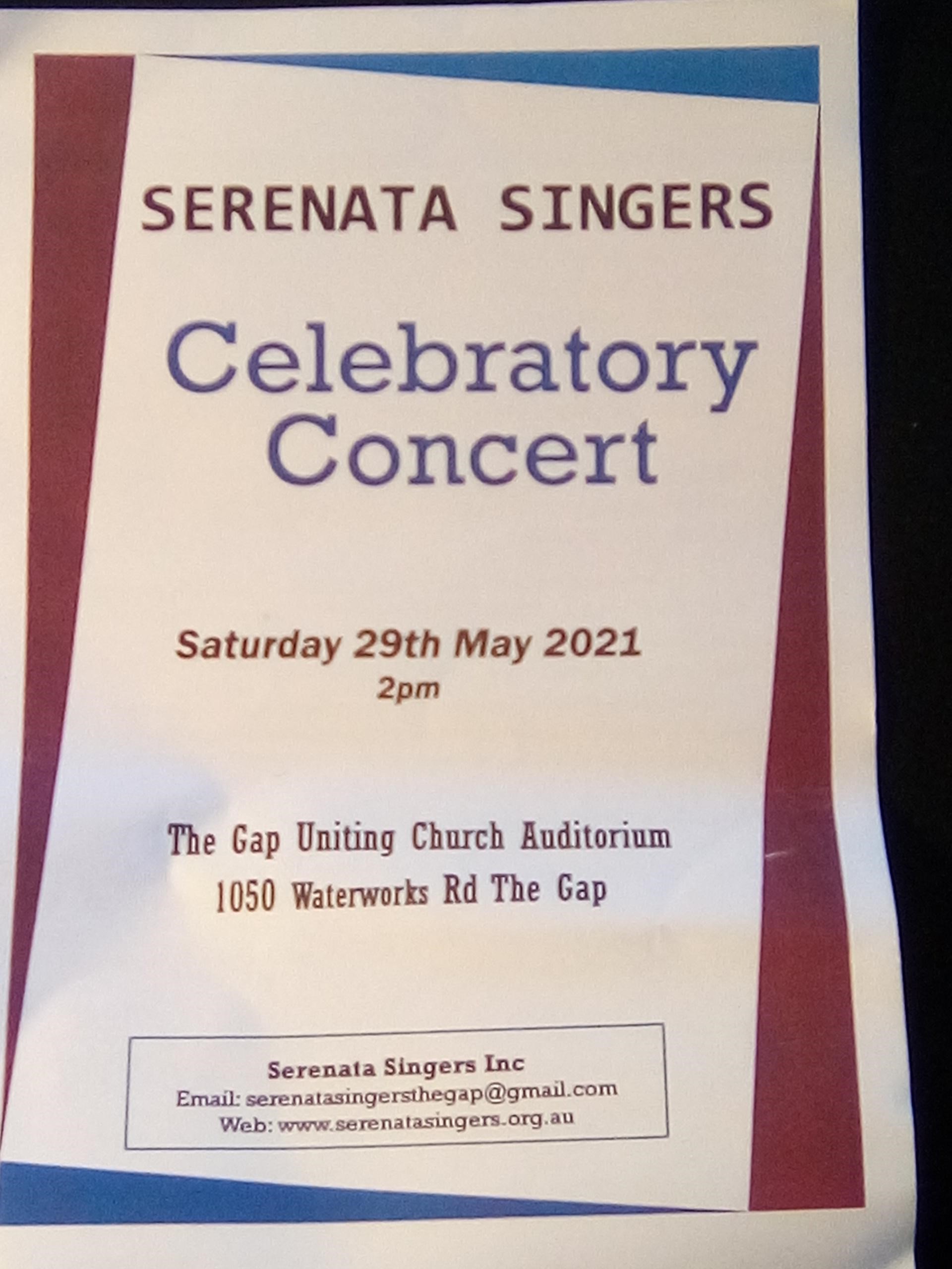 The Serenata Singers presented a belated 50th anniversary concert for family, friends and former members of the choir at The Gap Uniting Church on Saturday afternoon, 29 May 2021. Better late than never! The choir was keen to return to performing and relished the opportunity to sing in front of an appreciative audience.